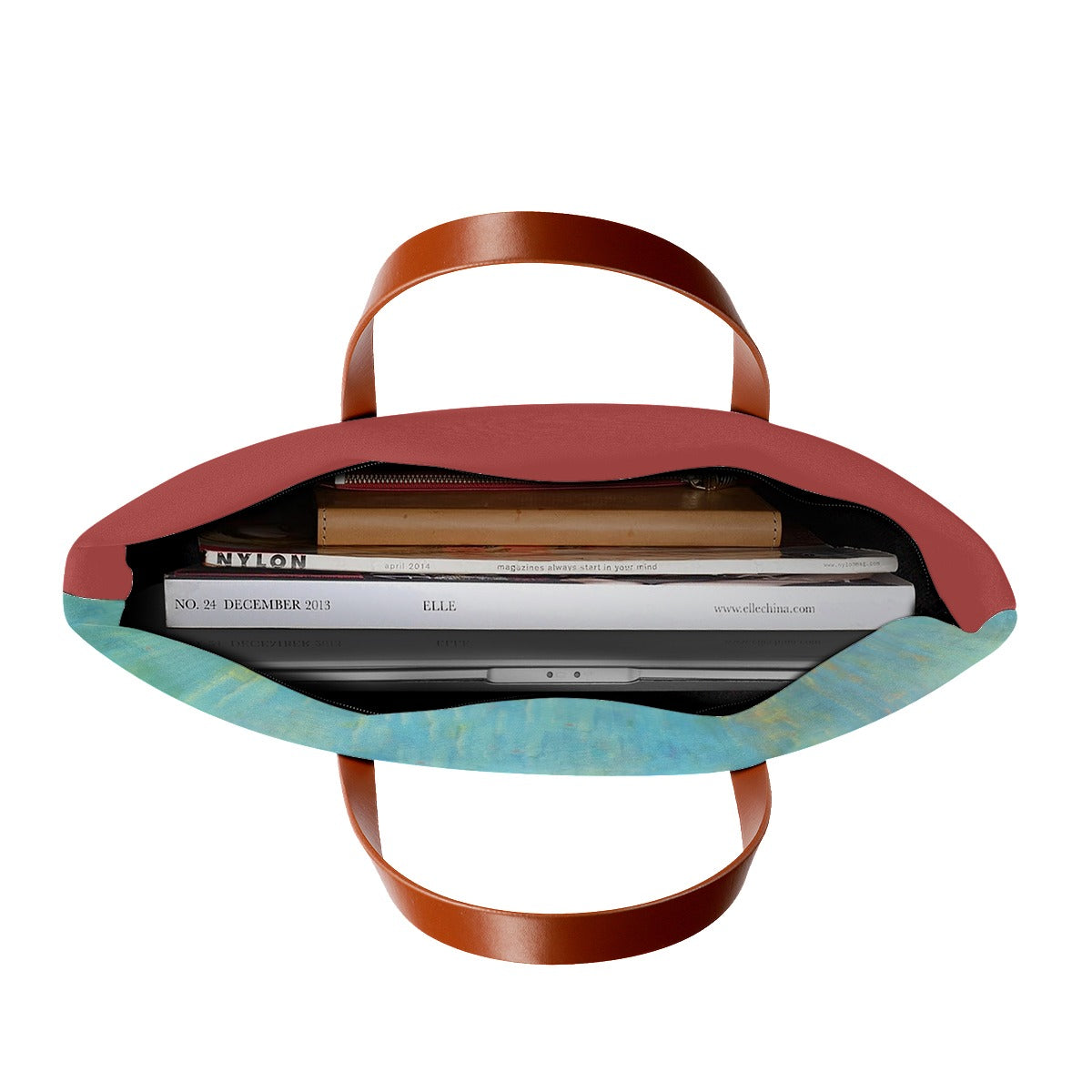 - Waterproof fabric, large capacity, blacke zipper and lining, brown strap.
