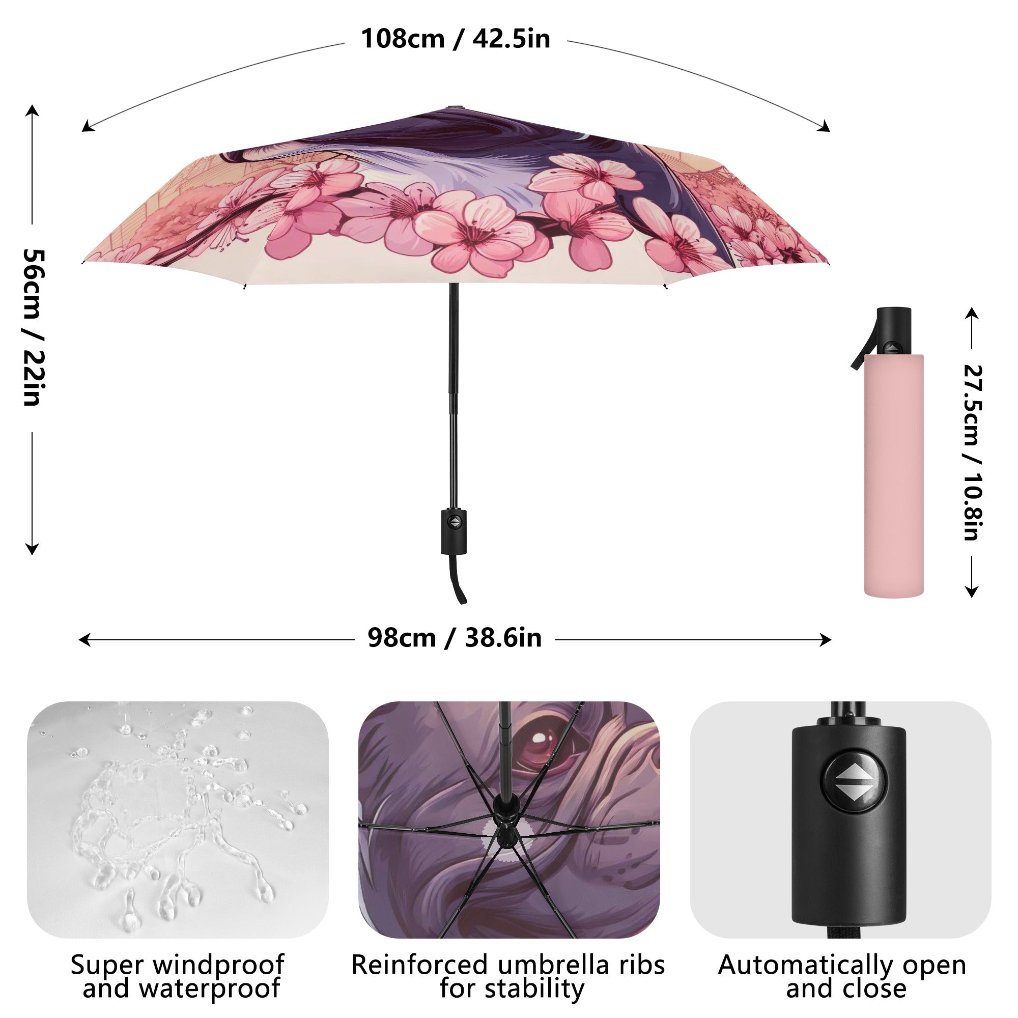 - Automatic Open & Close Mechanism: Experience the convenience of our automatic open and close system, supported by a strong steel black pole. This feature allows for easy one-handed operation.