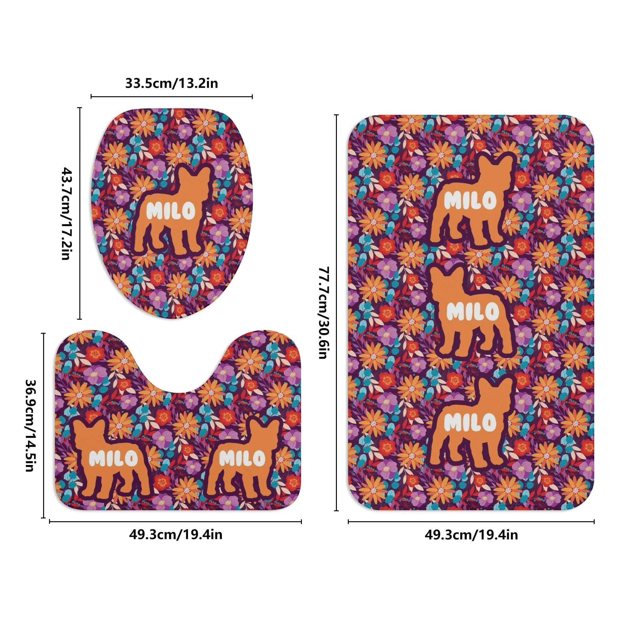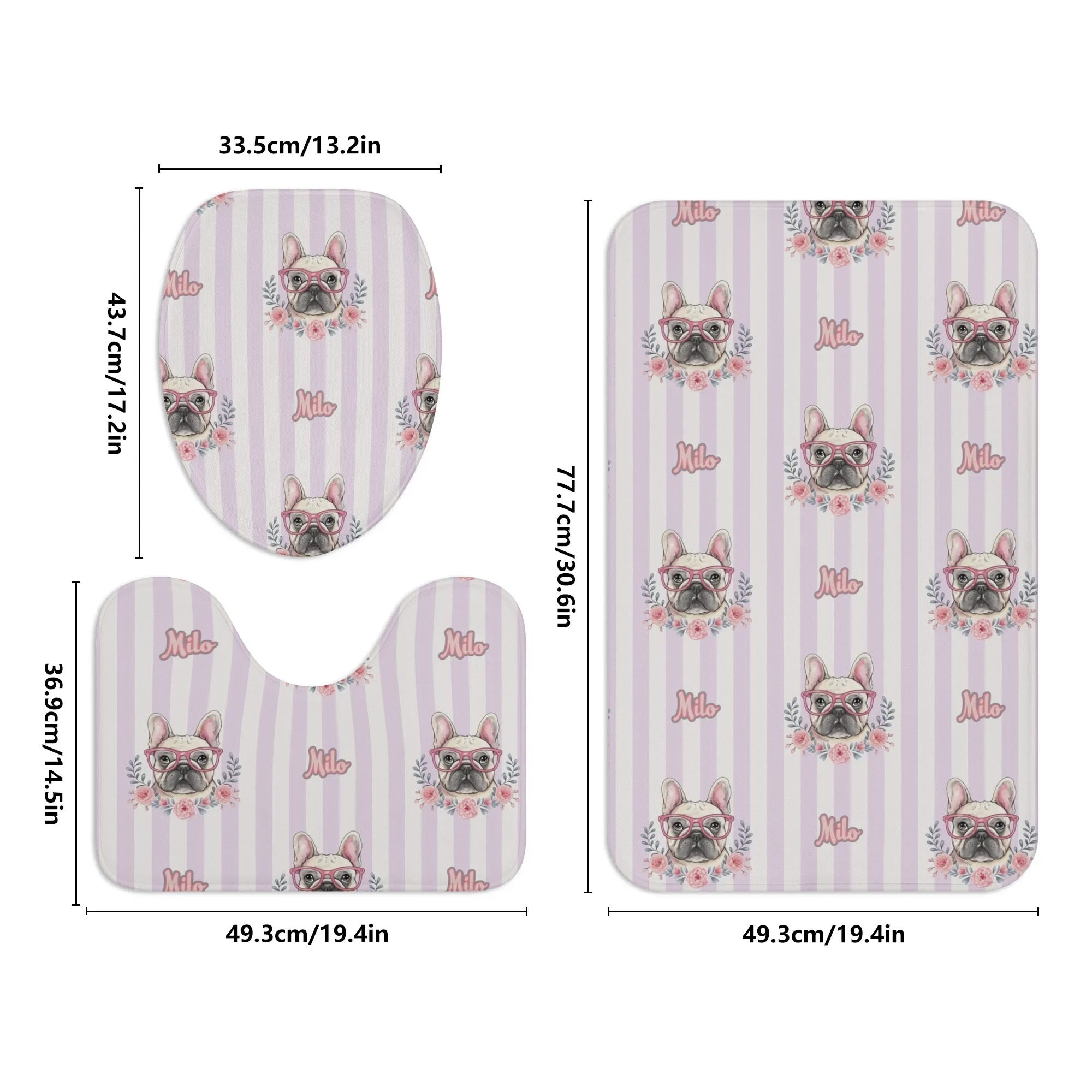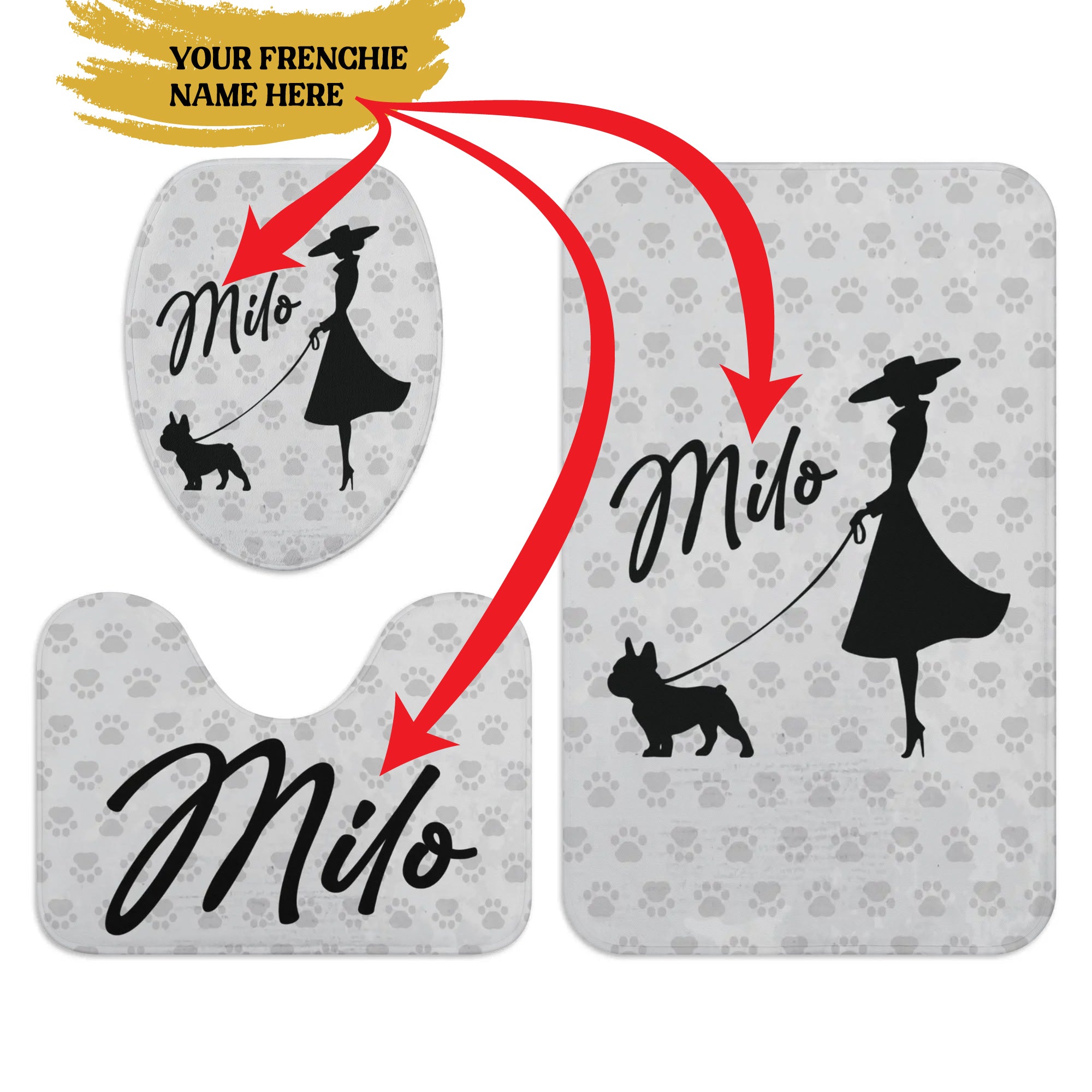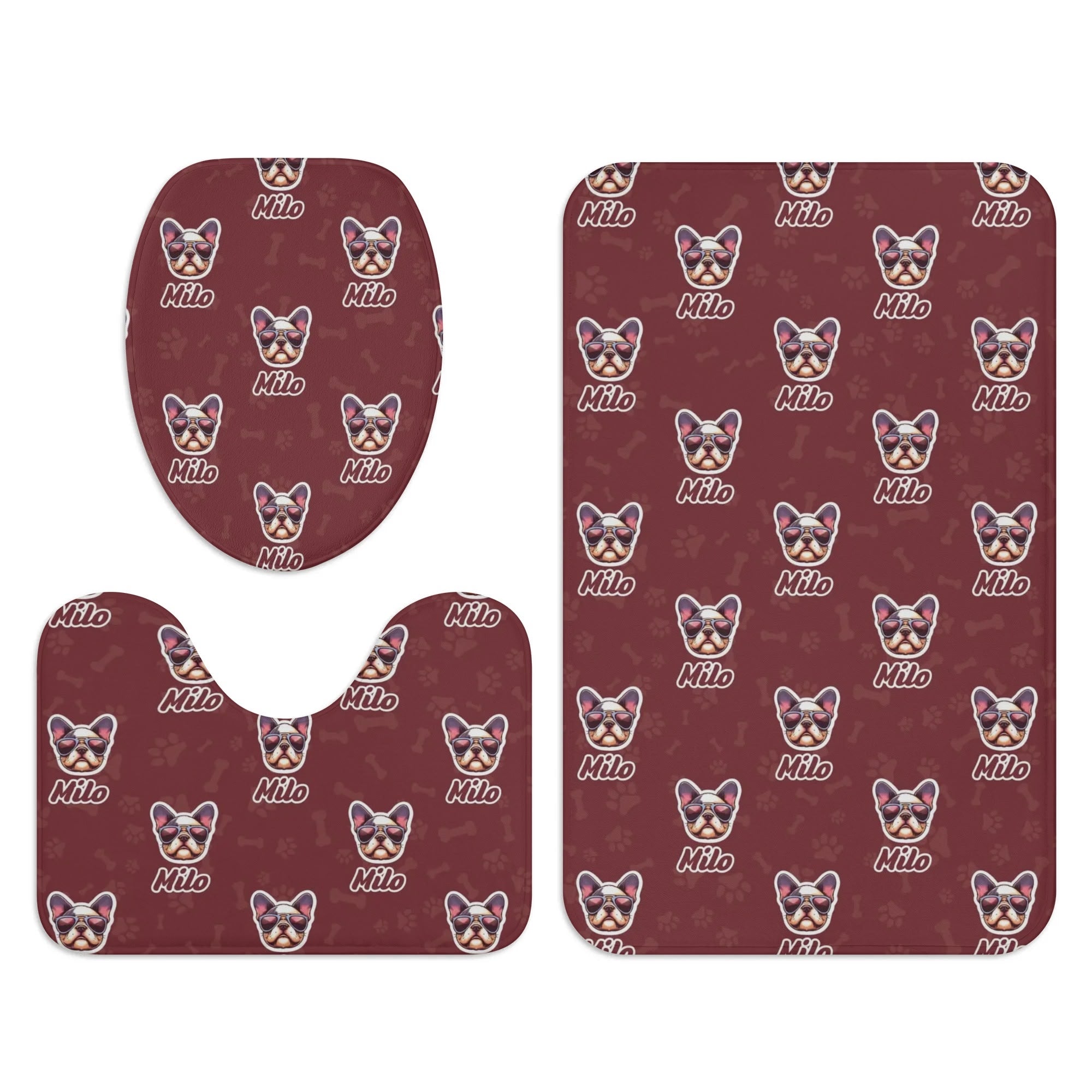 Add a playful touch to your bathroom with this adorable, personalized Frenchie Bathroom Toilet Set. Featuring a toilet cover, U-shaped pad, and floor rug, each piece is crafted from soft flannel with non-slip rubber soles. Personalize it with your French Bulldog's name for a unique and charming addition to your space.