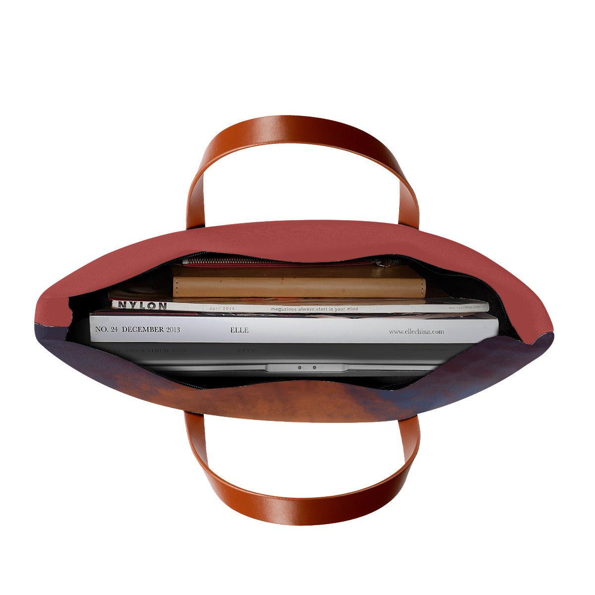 - Waterproof fabric, large capacity, blacke zipper and lining, brown strap.