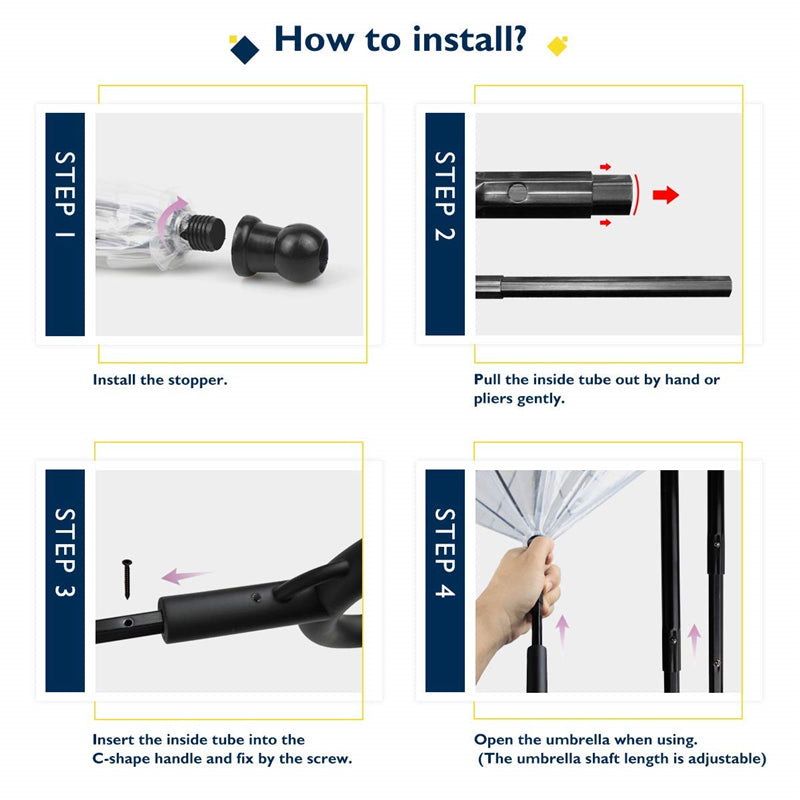 Tighten the umbrella cap, then pull the inside tube out by hand or pliers, insert the inside tube into the handle, and fix it with one screw, yet open and use this dog umbrella.