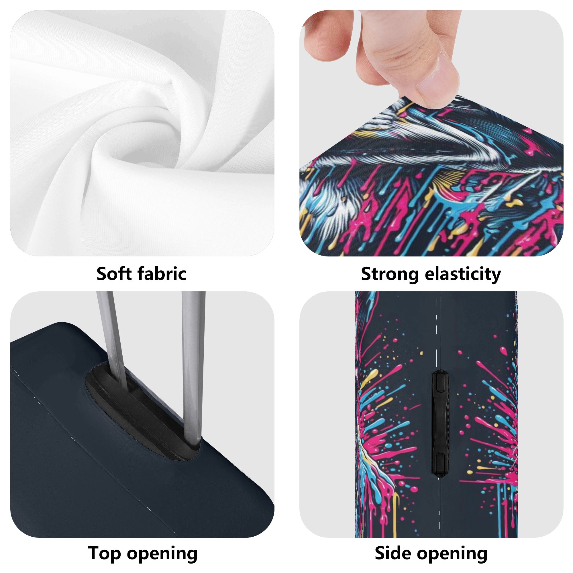 - The case cover comes in four sizes (S-XL) that correspond to different luggage box models. It has a unique opening on top for the telescopic handle and carry handle, and zippers on both sides for the side handles. This makes it easy to load and unload your luggage without removing the case cover.